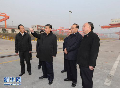 4日下午,习近平来到两江新区果园港。果园港是正在建设的第三代现代化内河港口、国家级铁路公路水路多式联运综合交通枢纽。习近平听取长江上游航运中心建设、现代化港口群布局、铁路公路水路联运、渝新欧国际铁路开行等情况介绍,了解重庆推动长江经济带发展和"一带一路"建设、扩大内陆地区开放开发以及功能区生态文明建设情况。他指出,"一带一路"建设为重庆提供了"走出去"的更大平台,推动长江经济带发展为重庆提供了更好融入中部和东部的重要载体,重庆发展潜力巨大、前景光明。得知渝新欧班列运营情况良好,习近平很高兴,要求重庆完善各个开放平台,建设内陆国际物流枢纽和口岸高地,建设内陆开放高地。